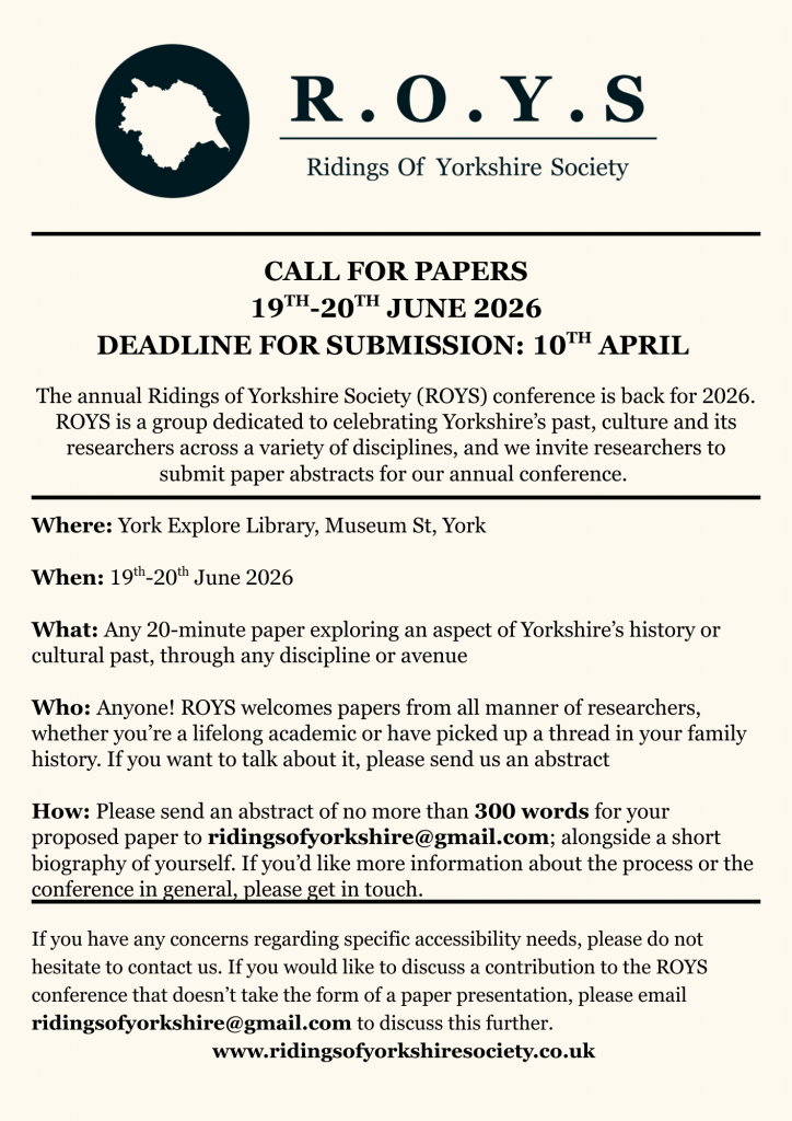 If you would like a plaintext or PDF version of the Call for Papers please email help@ridingsofyorkshiresociety.co.uk and we will be happy to send one via email.